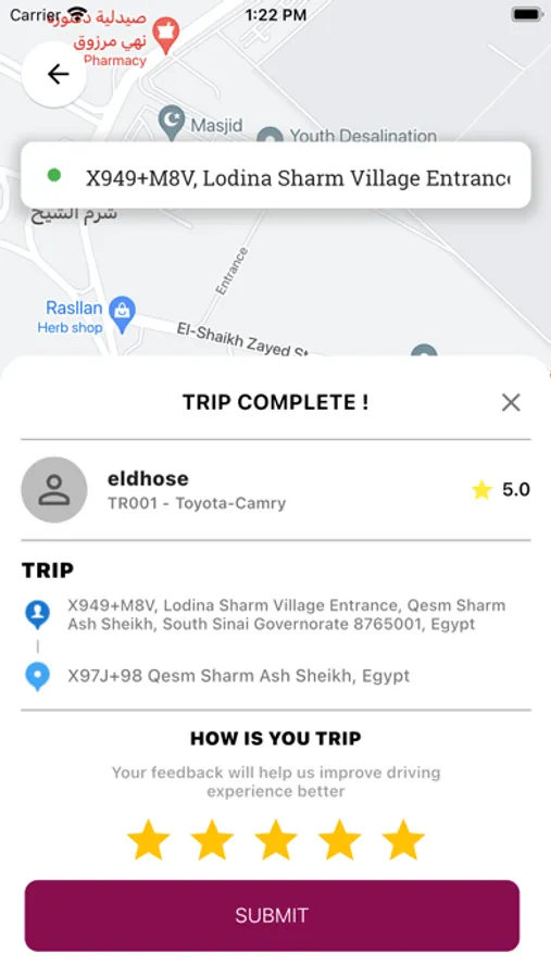 When you arrive at your destination and exit the vehicle, your trip ends. Your fare is automatically calculated and charged to the payment method you've linked to your Sharm Taxi account.