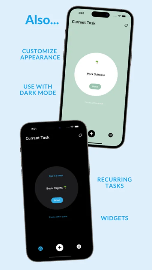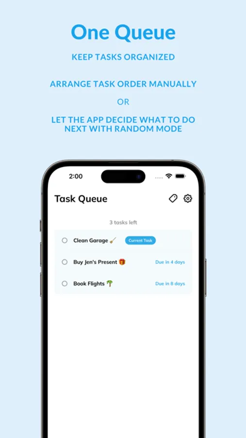Let the app decide what to do next. When the random mode is on, the order of your task queue will be randomized.