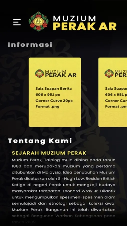 Download the app and experience Augmented Reality (AR) at Muzium Perak via your mobile phone! This app is a platform for everyone to feel the virtual experience of Muzium Perak and get info such as: