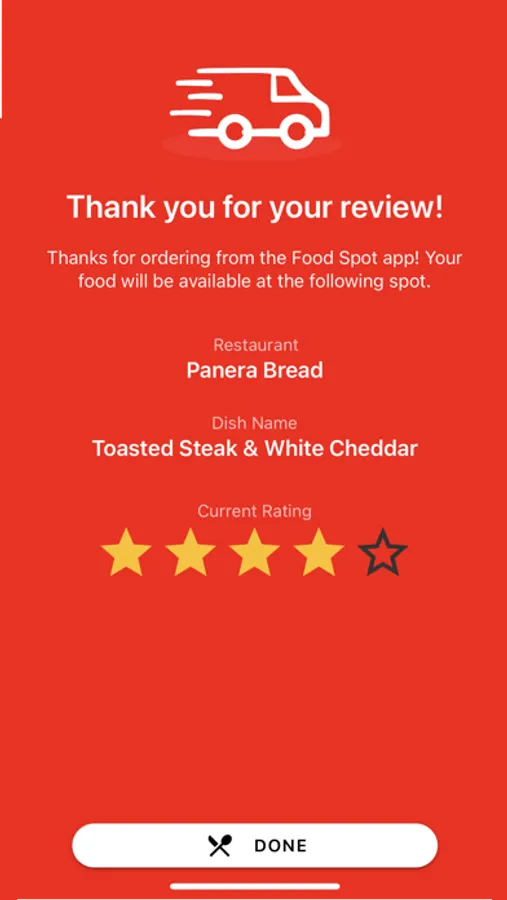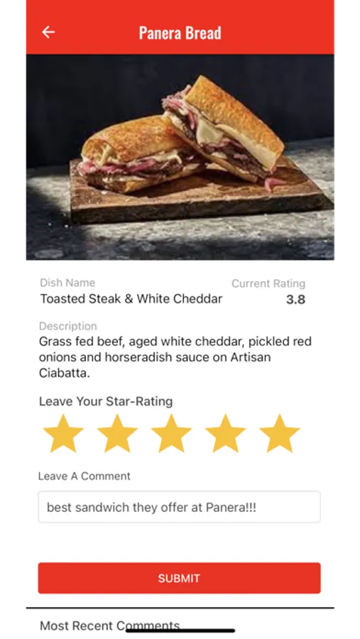 Features include submitting your own 1-5 star review for each dish with optional comments.