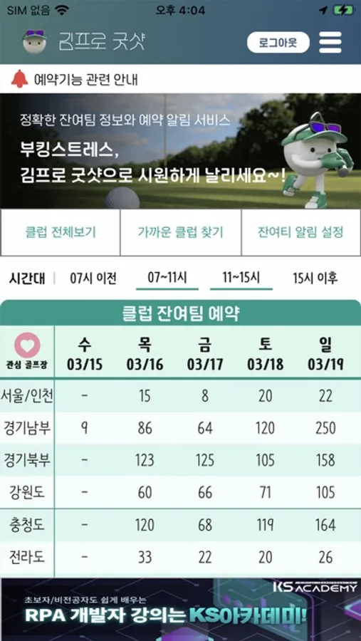 원하는 날짜와 지역을 테이블 형태로 한 눈에 확인할 수 있고 잔여티가 많은 순서로 골프장을 상단에 보여주어 확률을 높혀줍니다.