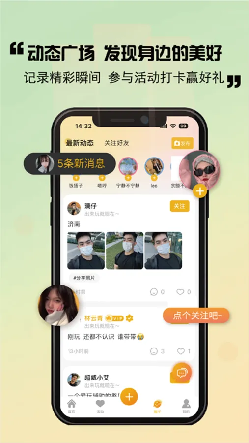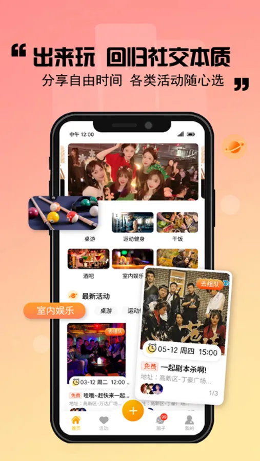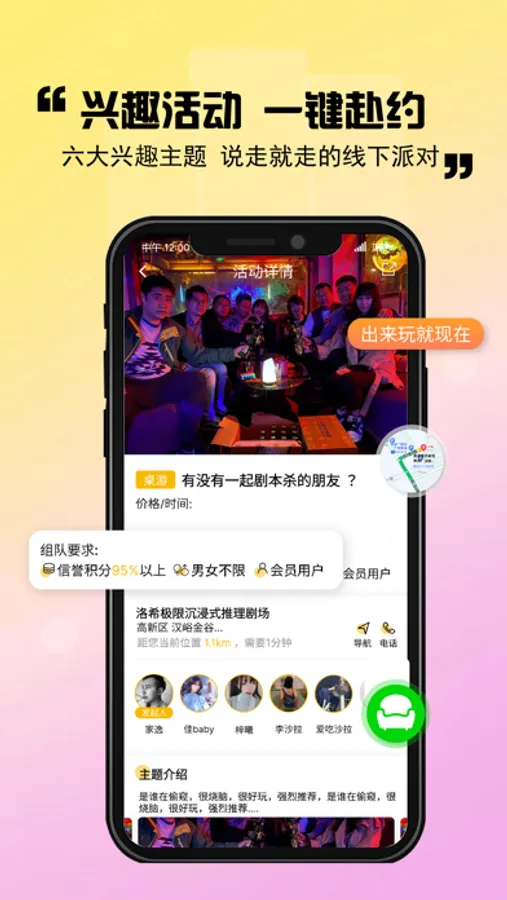 不同分类活动供您选择,不管您是”麦霸“”剧本杀资深玩家“,还是缺少饭友的”干饭王“,在这里总有一场活动适合你~活动专属聊天室,畅所欲言,对直接见面后的尴尬say拜拜~