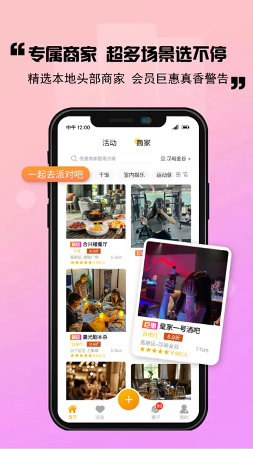 填写活动信息可选择平台选择商家,使用平台用户专属优惠,一键发布寻找相同兴趣的朋友线下嗨起来~