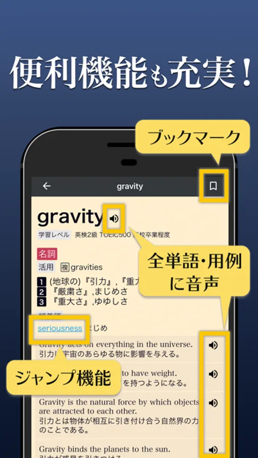 圧倒的な調べやすさ。語釈と用例も充実。例文の発音再生にまで対応した究極の英語辞書アプリ!