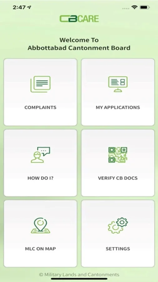 Cantonment Board Citizen Assistance and Rapid Execution (CBCARE) System is introduced by Military Lands and Cantonments Departmentt in all cantonments of Pakistan. The Mobile App is integrated with CBCARE Centers established in Cantonment Boards. CBCARE Center is first point of contact for the general public. The Mobile App serves as complementary channel between citizen and Cantonment Boards. Residents can use the app for the following: