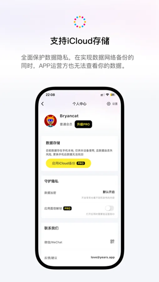 - 记录内容只会通过iCloud同步备份(默认为关闭),不经过「年华记」服务器,研发团队也看不到你的数据