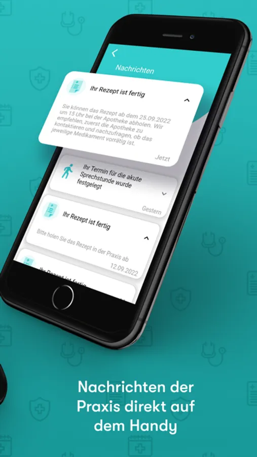 Sobald sie eine Nachricht der Praxis bekommen haben, erscheint diese als Push-Benachrichtigung auf Ihrem Handy. Eine neue Nachricht erkennen sie an dem roten Punkt an dem Nachrichten Button in der oberen rechten Ecke auf dem Homescreen. Dort finden Sie alle Nachrichten und Benachrichtigungen der Praxis.