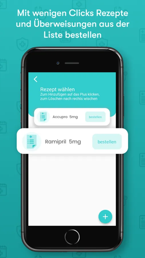 Unter Rezepte und Überweisungen können Sie eine Liste Ihrer Rezepte und Überweisungen erstellen, indem Sie auf das Plus in der unteren rechten Ecke clicken. Sobald Sie die Rezepte oder Überweisungen der Liste hinzugefügt haben, können sie es von dort aus durch den „bestellen“ Button bestellen. Sobald die Bestellung abgeschlossen ist, können Sie den Status der Bearbeitung unter „Meine Anfragen“ einsehen. Alte Rezepte und Überweisung, die nicht mehr benötigt werden, können Sie aus der Liste löschen, indem Sie es nach rechts wischen und dann auf „löschen“ clicken.