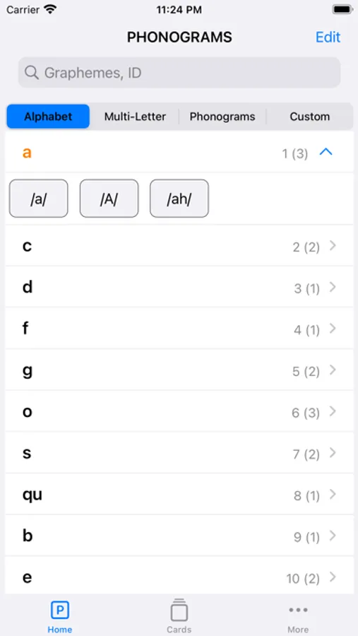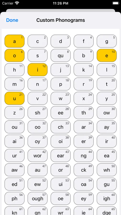 • Sort Phonograms between Alphabet, Multi-Letter, All(Phonograms) and Custom