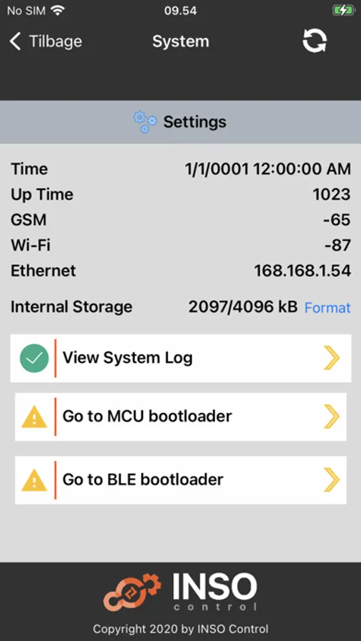 This app is used to setup the configuration of the equipment produced by INSO Control. The app allows to change parameter values of the applications, set the date/time, etc. The access is protected by a pin code which is user defined.