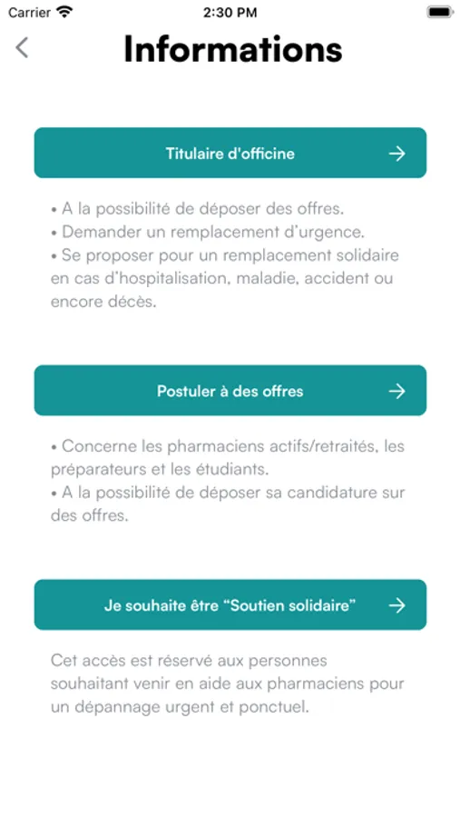 pharmacien ». Le pharmacien inscrit comme « soutien solidaire » pourra ainsi remplacer rapidement un pharmacien ou une pharmacie en difficulté (décès, accidents, maladies), pour une période courte en attendant de trouver une solution pérenne. Cette application est seulement un intermédiaire transparent qui a pour seul rôle la mise en relation d'un utilisateur en recherche d’emploi et un utilisateur offreur d’emploi. L’application est téléchargeable dès à présent sur App Store; les données sont traitées uniquement par l’URPS.