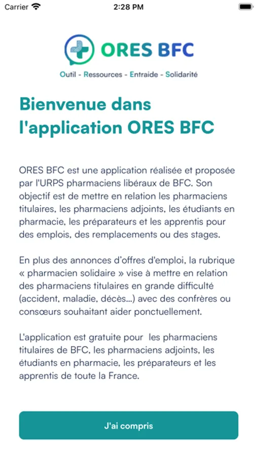 Application mobile ORES BFC- « Outil – Ressources – Entraide – Solidarité Bourgogne-Franche-Comté ». ORES BFC a été créée et entièrement financée par l'URPS Pharmaciens libéraux de Bourgogne-Franche-Comté. Elle vise à faciliter la mise en relation entre les pharmacies de la région BFC et les candidats à l’emploi du secteur de la pharmacie d’officine. En effet, les pharmacies d’officine rencontrent depuis quelques années de réelles difficultés de recrutement et d’effectif. Suite à ce constat, nous avons souhaité créer cette application mobile pour faciliter la mise en relation des pharmacies « offreuses d’emploi » et les candidats ou demandeurs d’emploi. L’application permet aux pharmacies d’officine installées en région Bourgogne-Franche-Comté de déposer des offres d’emploi et permet aux candidats (pharmaciens, préparateurs et étudiants) de toute la France inscrits sur l’application d’y répondre. ORES BFC est entièrement gratuite pour tous les utilisateurs. ORES BFC est aussi dotée de la rubrique d’entraide « Soutien Solidaire » qui a été créée pour apporter une assistance rapide et ponctuelle aux pharmacies en difficulté pour cause de maladie, de décès ou autres motifs impérieux. Ainsi, un pharmacien qui crée son compte ORES et s’inscrit comme « Soutien solidaire » pourra être alerté et si possible, aider et remplacer dans l’urgence un confrère ou une consœur pour permettre à l’officine de poursuivre son activité conformément au code de la santé publique. En effet, selon le code de la santé publique « Une officine ne peut rester ouverte en l'absence de son titulaire que si celui-ci s'est fait régulièrement remplacer. L'annexe mentionnée à l'article L. 5125-7-1 ne peut rester ouverte au public en l'absence de