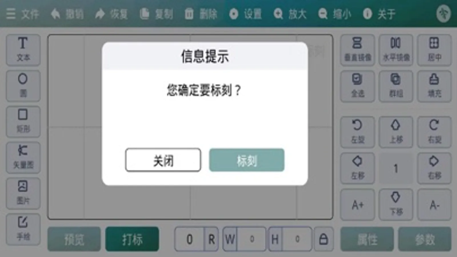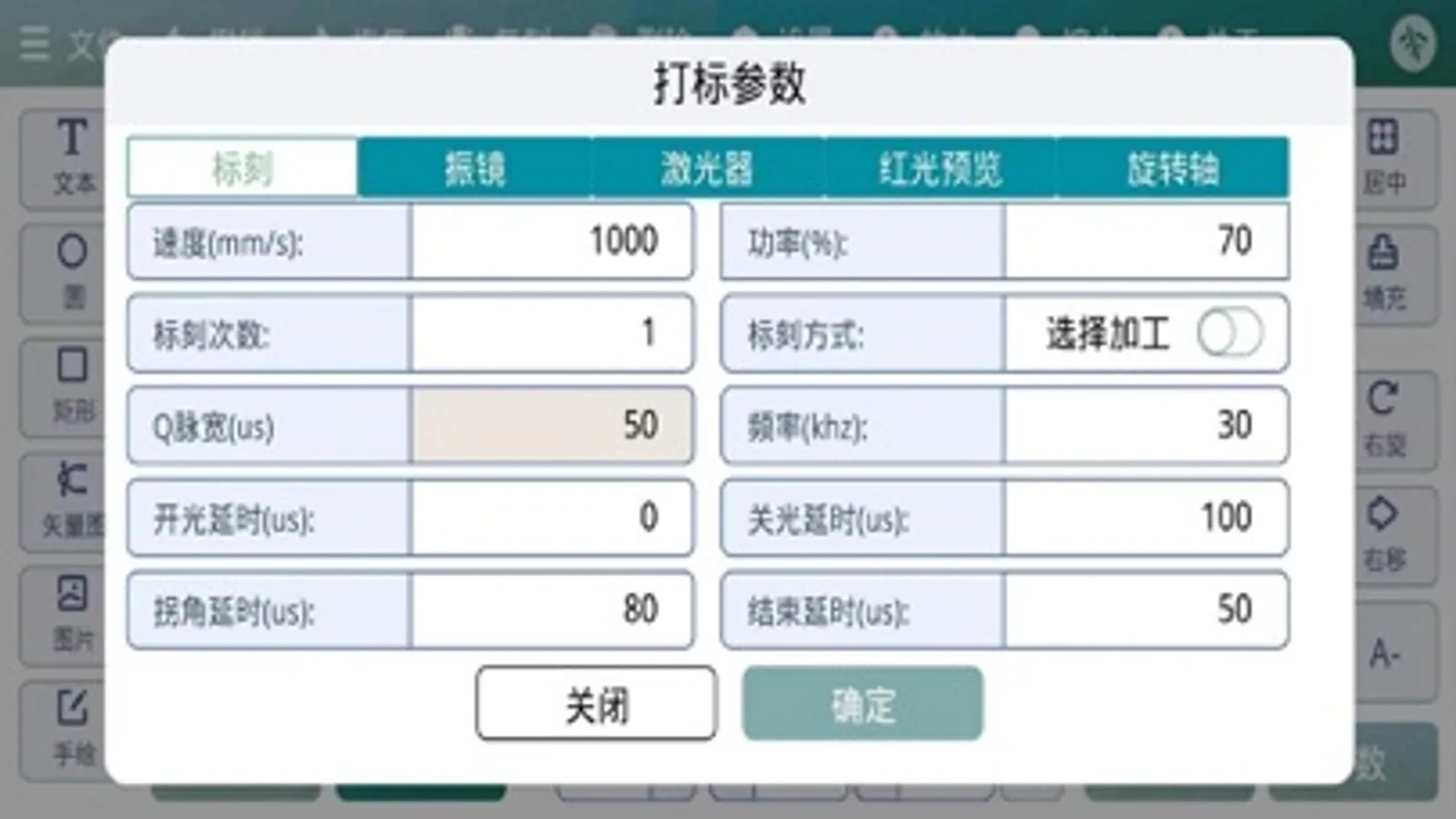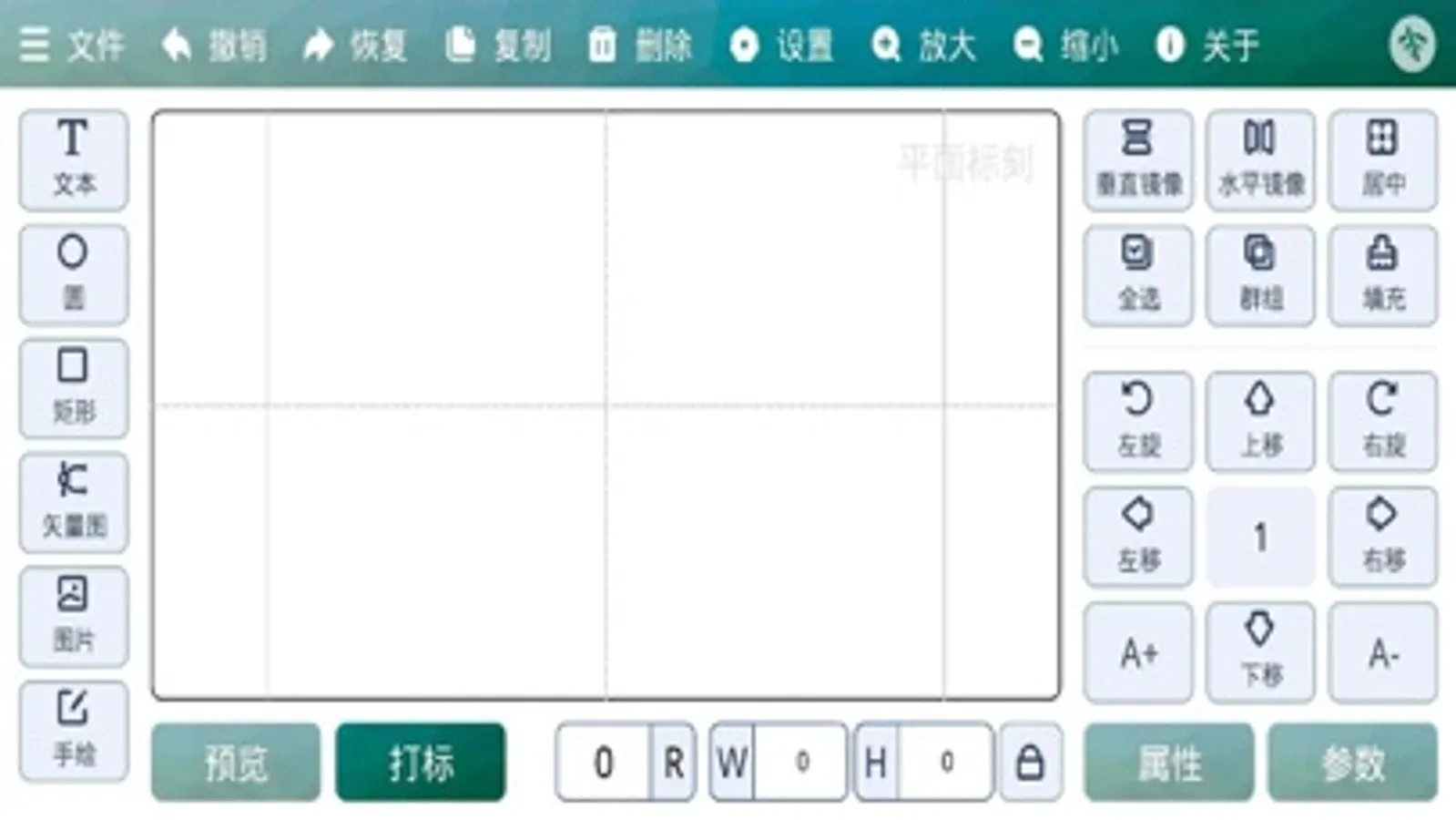 iMarkCtrl支持文本、圆、矩形、图片、矢量图形编辑,并且可对图形操作包括:移动,放大和缩小,旋转,镜像,填充等。用户可快速编辑激光打标文档,通过WIFI传输到设备上进行雕刻。