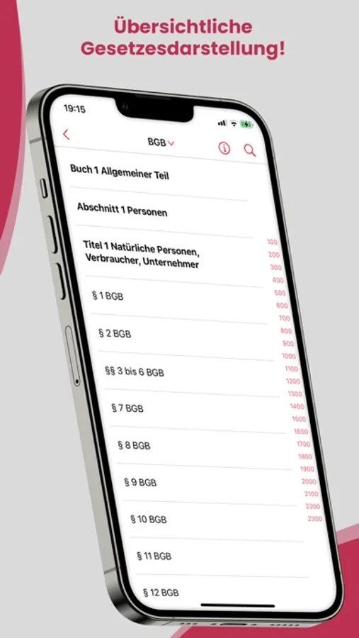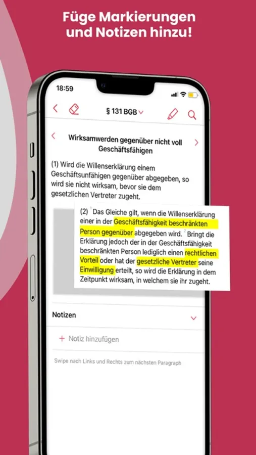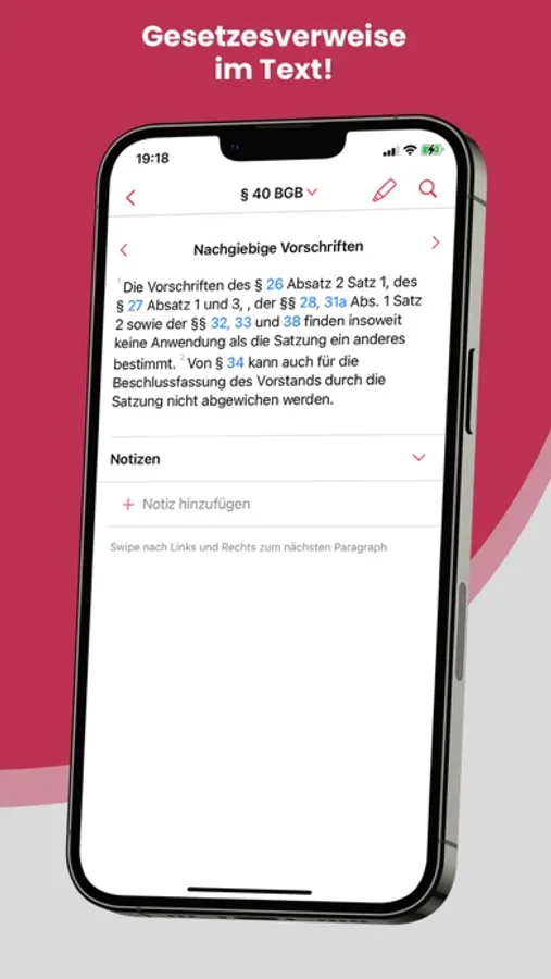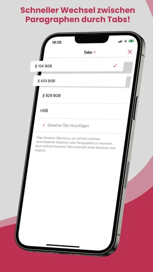 Außerdem enthält die App Gesetzesverweise bereits im Text. Tabs ermöglichen den schnellen Wechsel zwischen Paragraphen und Gesetzen.