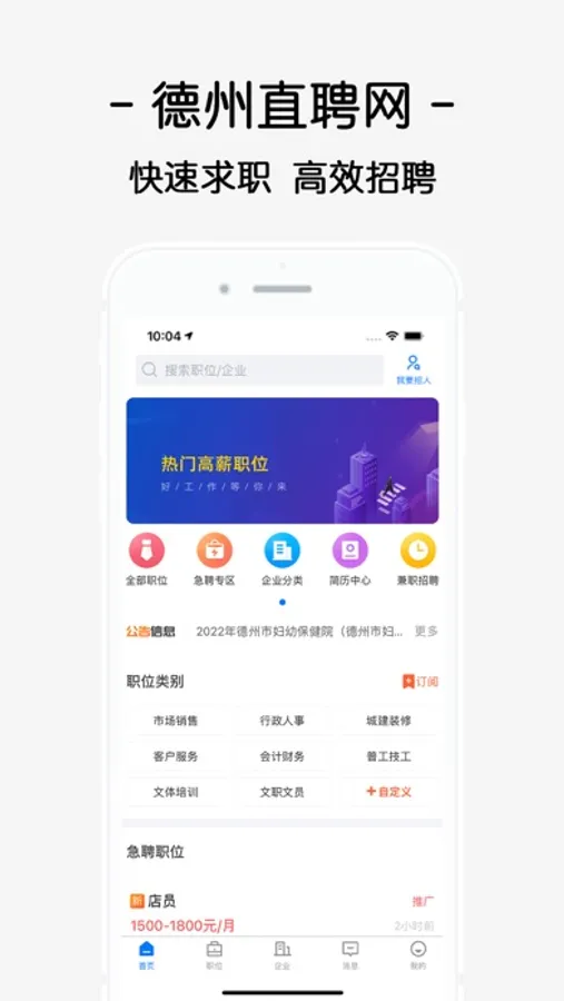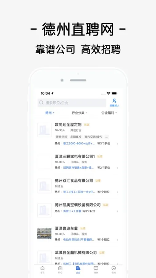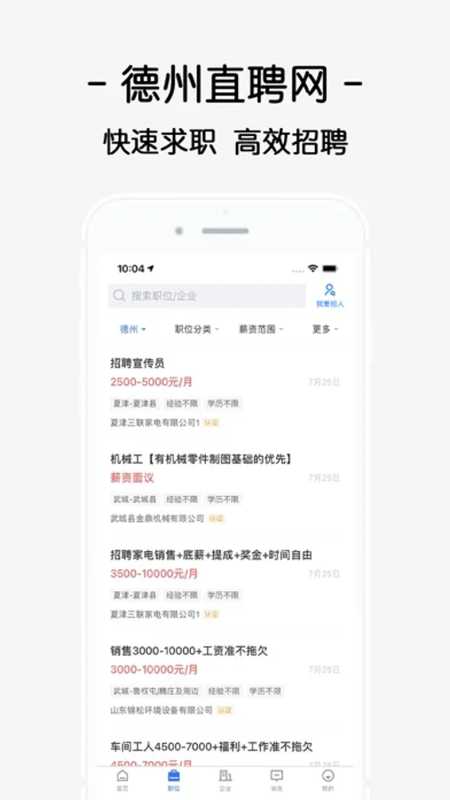 德州招聘、德州找工作,就看德州直聘网! 德州直聘网是德州市德州直聘网络科技有限公司旗下招聘网站,致力于为求职者提供德州本地优质招聘信息、为企业提供招聘渠道,帮助每一个求职者在德州直聘网找到合适的工作!