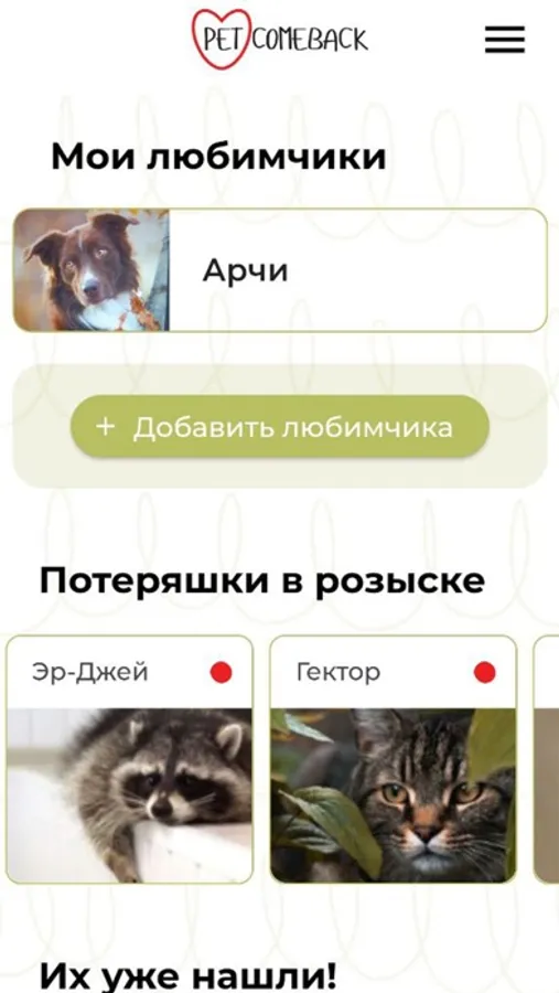 PetComeBack – приложение для самых ответственных владельцев домашних животных. Это современная система поиска пропавших питомцев.