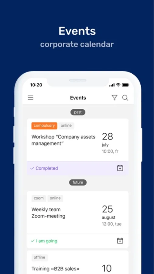 ⁃ Calendar of corporate events with “sign up to participate” feature
