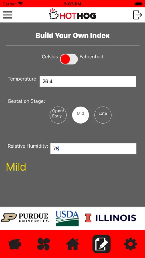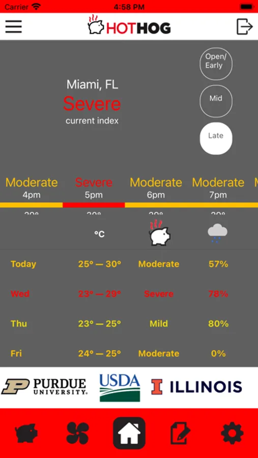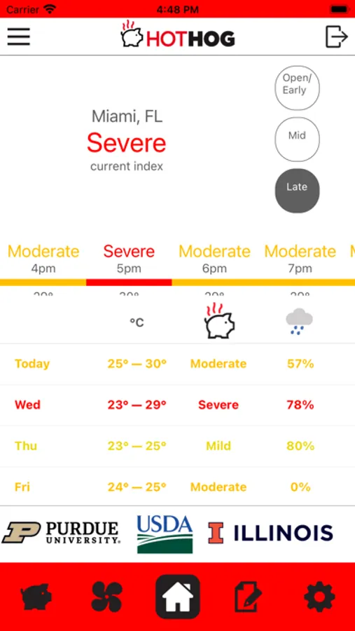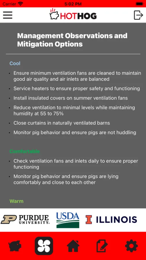 HotHog provides hourly and daily predictions of thermal comfort and stress in non-pregnant, mid-gestation, and late-gestation sows based upon a decision support tool developed through a USDA National Institute of Food and Agriculture grant by scientists with the USDA Agricultural Research Service, the University of Illinois, and Purdue University. Specific HotHog features are: