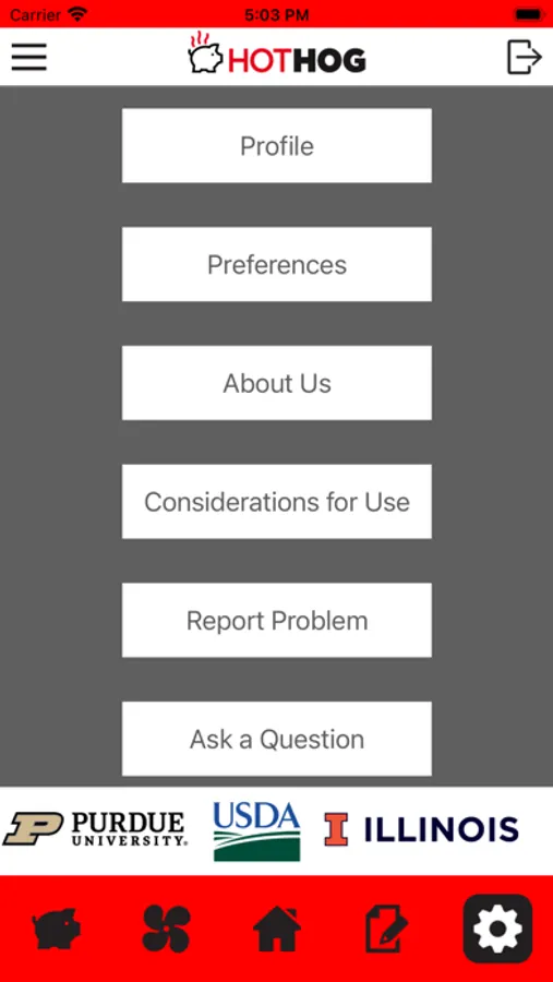 • The gear icon takes the user to a settings page where they can: 1) edit their individual profile, 2) set preferences such as dark/light mode or Fahrenheit/Celcius, 3) find information on how the decision support tool and HotHog were developed, 4) make considerations for use of HotHog, and 5) report problems with HotHog or ask specific questions pertaining to swine thermal stress.
