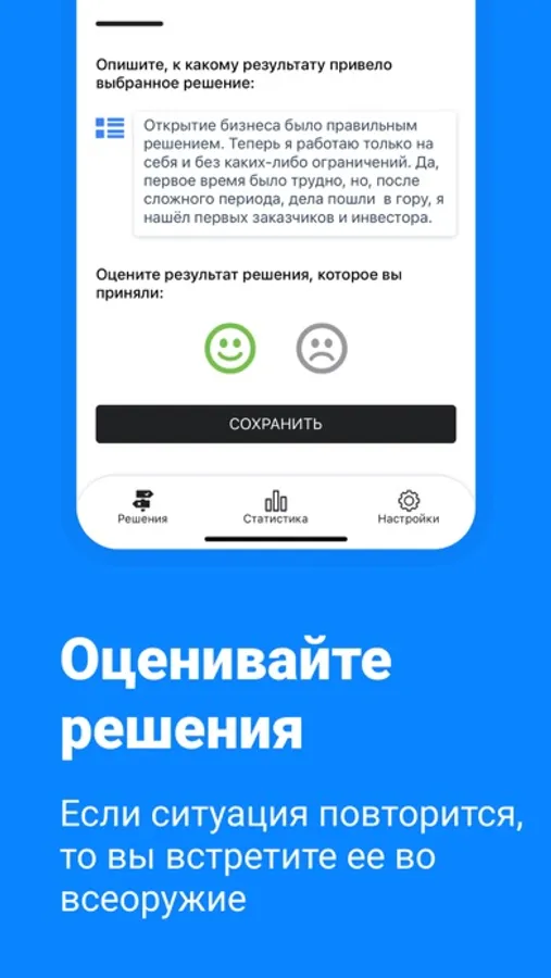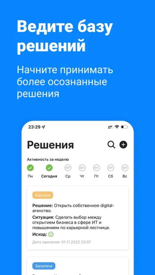 1. «Решения». В этом разделе вы фиксируете решения, которые приняли или собираетесь принять. Исход каждого решения можно и нужно оценивать. Это позволит сформировать вашу личную статистику об эффективности решений.
