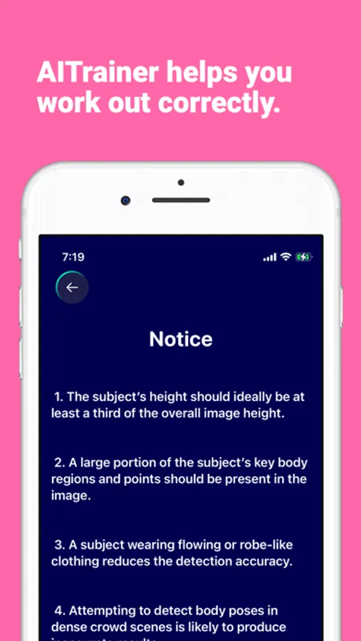 - Camera access must be allowed to recognize and analyze the user's posture. Please select the action to be performed, be familiar with the notices, and allow access to the camera.