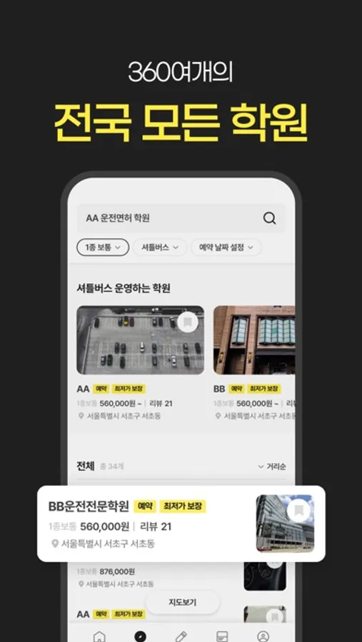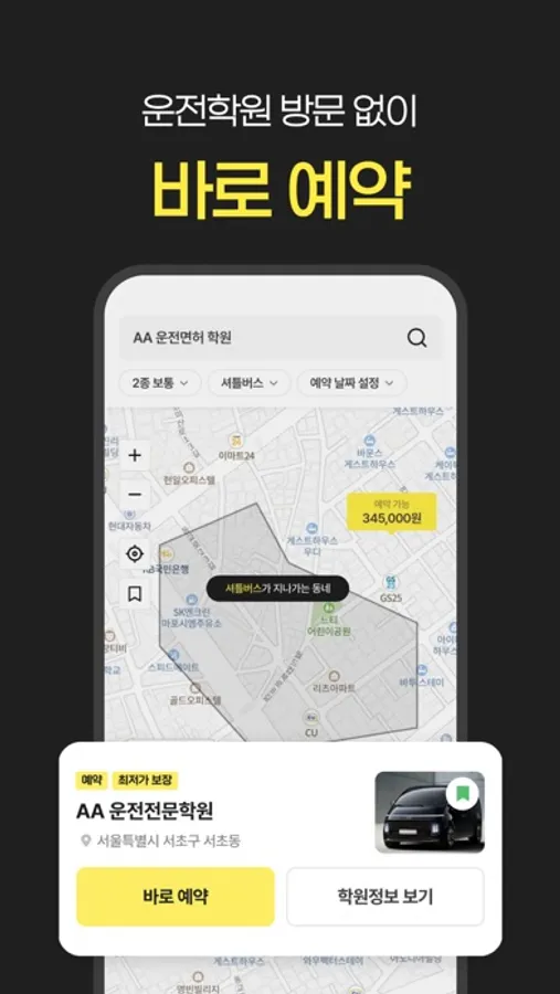 - 다니고 싶은 학원의 가격, 수업, 셔틀 정보를 확인하고 원하는 운전면허 종류, 날짜, 시간만 선택하면 방문보다 빠르고 쉽고 편하게 예약이 가능합니다.