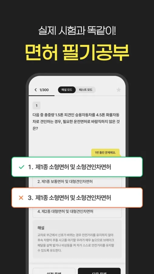 - 실제 운전면허 학과시험과 동일한 문제 구성과 시간으로 구현된 모의고사를 통해 시험 합격 여부를 확인할 수 있습니다.