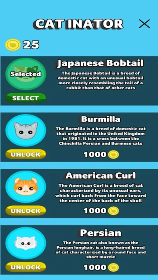 If you love cats and challenges this is the game for you. Have the chance to play with many cute cats and learn a little about each breed of cat. Collect them all and don't forget to pet them everytime you got a chance.