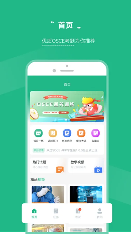 OSCE掌考通,临床医学考试刷题、真题库,海量题库让学医的用户提升专业能力,专注于临床医学复习备考,题库包含OSCE临床执业医师考试所有题型并搭配详细解析和操作视频!