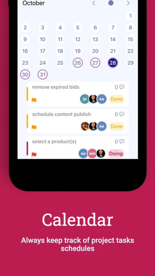 Doteam enables you to keep track of task dates with a special calendar for each project