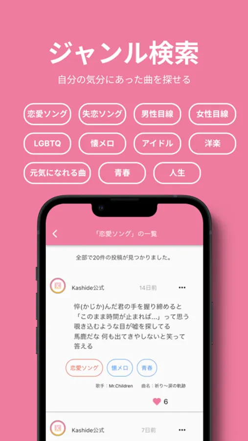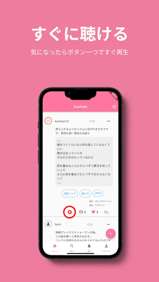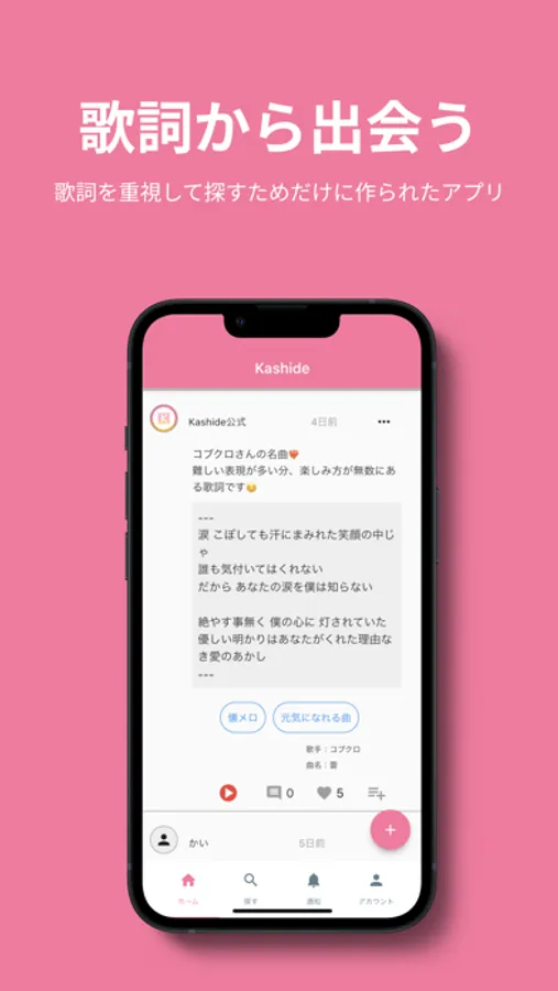 Kashideは、歌詞を中心として構成された新感覚の音楽アプリです。