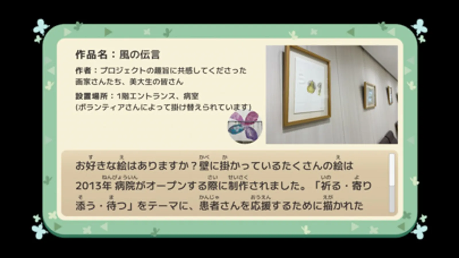 国立病院機構四国こどもとおとなの医療センターのARアプリです。毎年、隣接する善通寺養護学校の卒業生たちと、蝶の壁画を描いてきました。このアプリでは、これまで描かれてきた蝶たちが、遙か彼方の大空へ飛び立ちます。また、蝶をタップすることで、病院内のアートの解説も見られます。