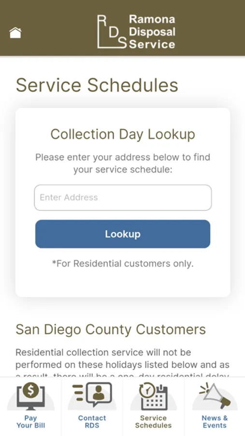 - Contact RDS directly through the app by phone or text. You may start or stop service, order carts and kitchen caddies, schedule bulky item pick-ups, and much more!