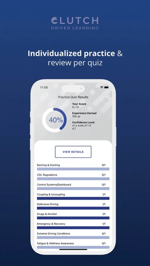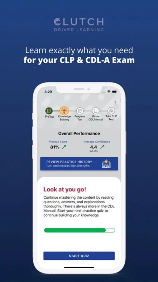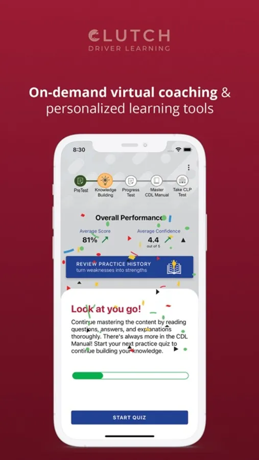 What makes CLUTCH the perfect option for you? Curated by a team of CDL experts from the trucking industry, CLUTCH prepares you for success by progressing alongside you as you learn. This personalized learning tool allows you to learn at your own pace, review your work, and achieve your learning goals through engaging tools such as virtual coaching, practice quizzes, and more!