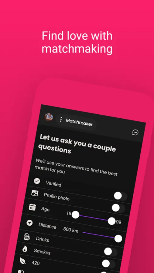 But that's not all, Dimmed also offers an AI Matchmaker to help you find love. The Matchmaker uses cutting-edge algorithms to match you with users who share your interests, values, and desires. Chat in complete privacy, with the ability to save messages, send photos, and share location. Make sure your match is real with Dimmed's Verification feature. This feature helps you avoid catfishing and ensures that you only connect with real people.