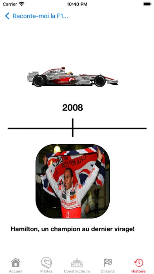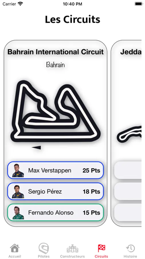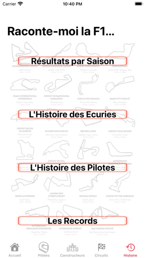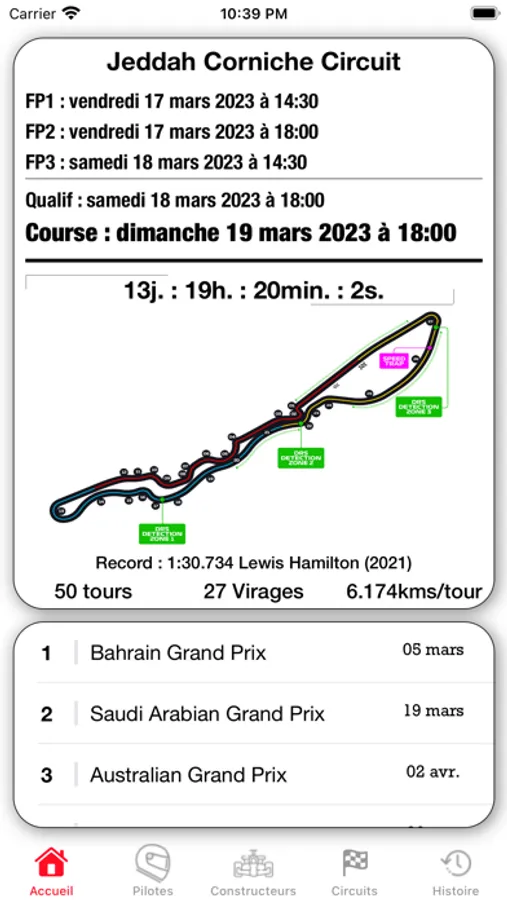 Visionnez les tracés des circuits et le classement des pilotes par Grand Prix ainsi que l’obtention du meilleur temps en course.
