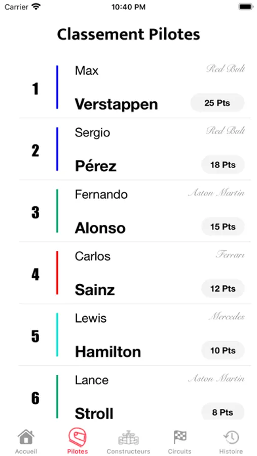 Consultez le classement des pilotes de Formule 1 avec leurs fiches détaillées et leurs résultats pour chaque course et sprint ainsi que le meilleur temps en course.