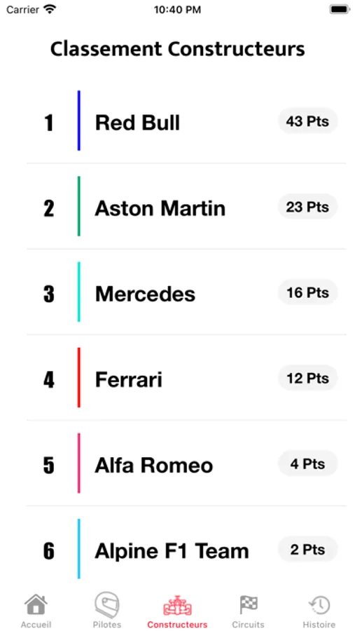 Consultez le classement des constructeurs de Formule 1 avec leurs fiches détaillées, les pilotes qui composent l’écurie, le nombre de victoires et la F1 avec laquelle l’écurie roule.