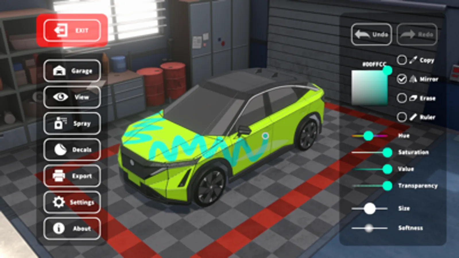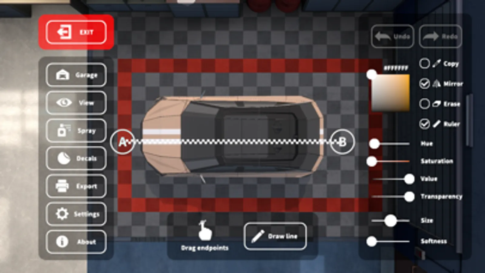 - Decals: apply custom text, album photos, numbers, and national or regional flags to the car body. Various tools are available for changing decal color, copying color, mirroring, and erasing decals.