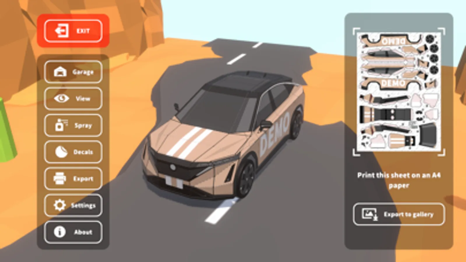 - Export: convert your 3D paint job into an unfolded component sheet and export it to the device album. You can print it on an A4 size paper to build a 3D papercraft car body.