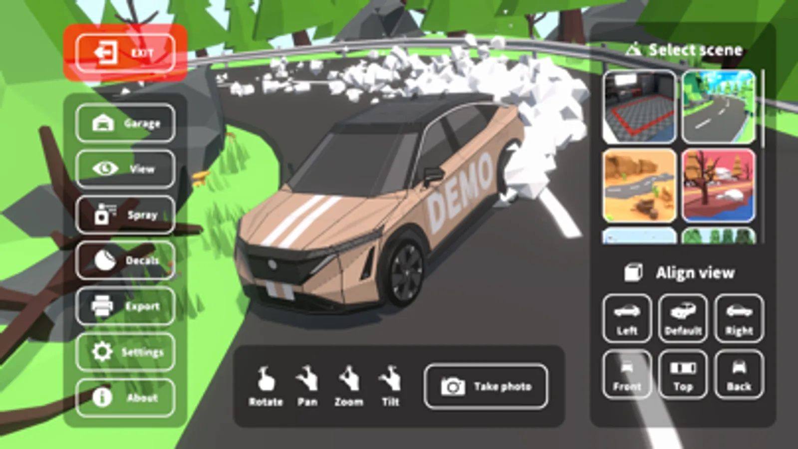 - View: preview your paint jobs and take screenshots in 8 different 3D scenes. Custom photo or camera image can be used as background.