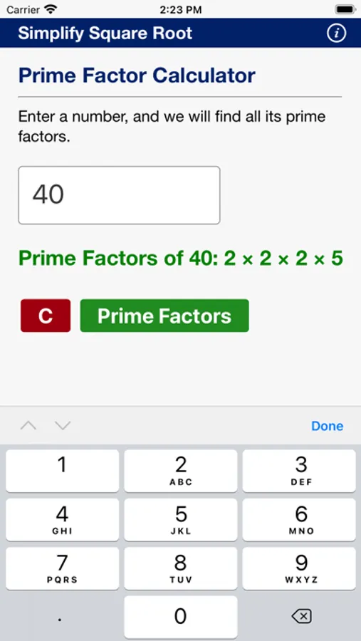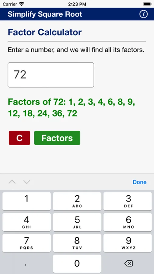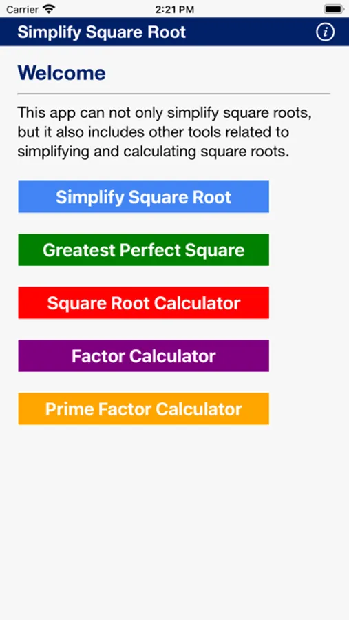 In addition to converting any square root into its simplest radical form, the app also includes a Square Root Calculator, a Greatest Perfect Square Calculator, a Factor Calculator, and a Prime Factor Calculator.