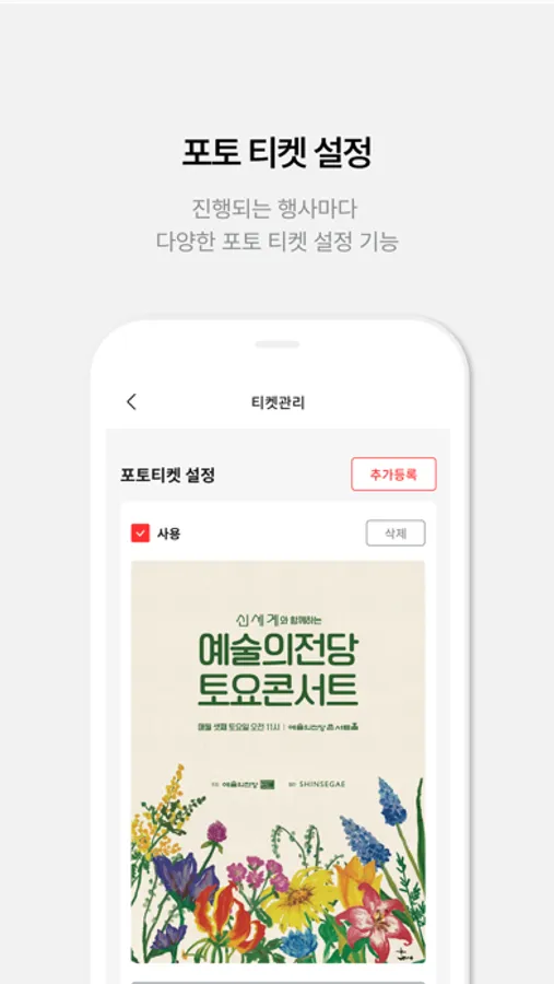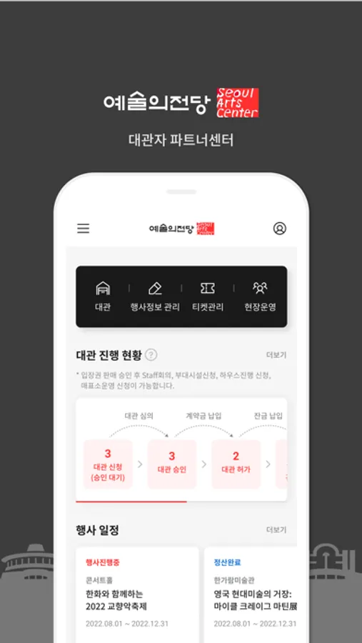 대관부터 정산관리, 행사정보 관리, 티켓관리, 현장운영 등의 대관 관련 각종 현황을 종합적으로 관리할 수 있는 모바일 서비스를 제공합니다.