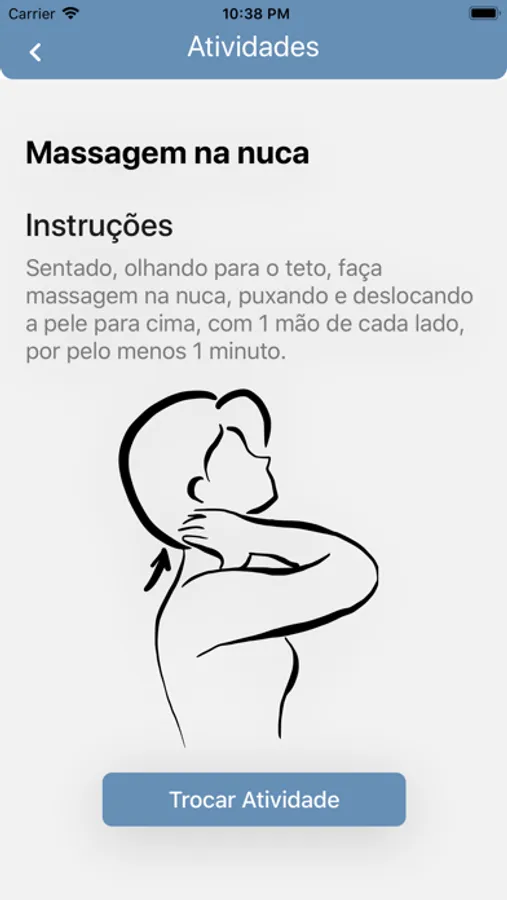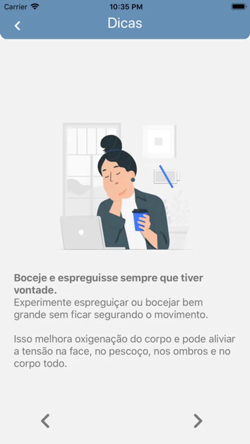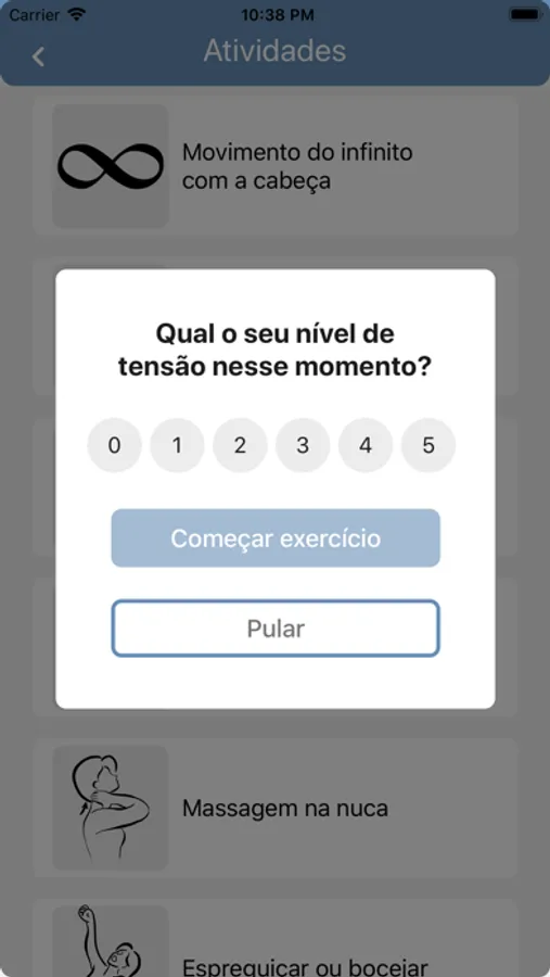 Além dessa ferramenta fantástica de lembrete para relaxar, o aplicativo conta também com sugestão de algum exercício ou atividade aleatória no momento da notificação. Atividades essas que ajudam a diminuir a tensão local e não demoram mais do que 1 ou 2 minutos para fazer.