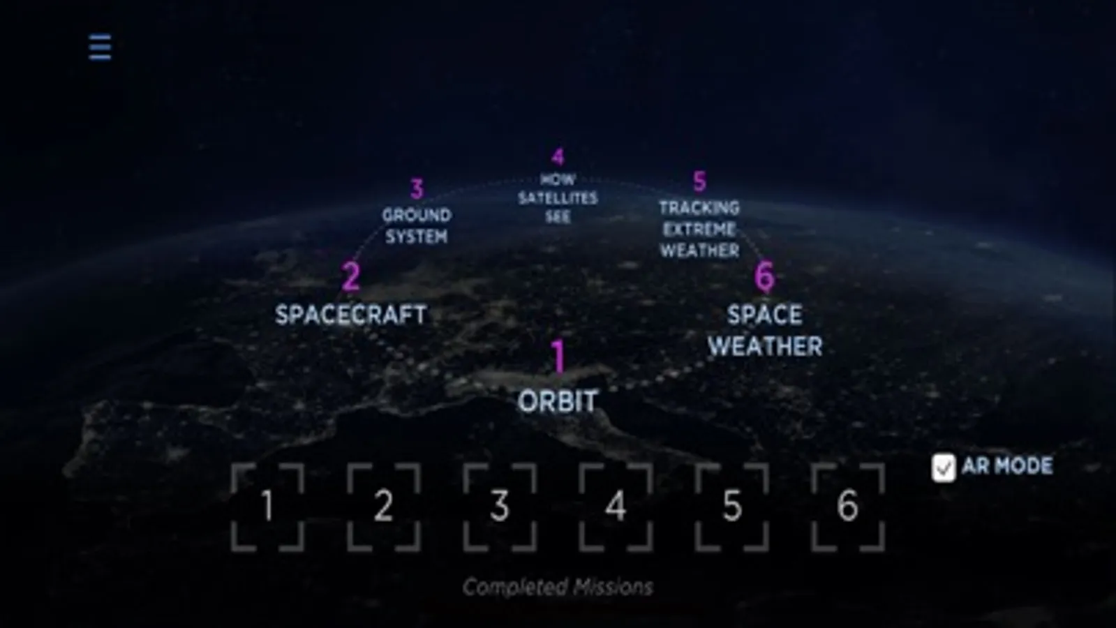 Learn about the satellites that monitor extreme weather and climate change in this immersive AR app. We'll challenge you to complete a series of missions, which will start with an interactive journey into space where you’ll see the satellites orbiting Earth and view all of their instruments up close. You’ll learn how the satellite instruments work, how they transmit data from space to a system of ground stations on Earth and end up in your weather forecast. You’ll learn about the electromagnetic spectrum and how the satellites see. And you’ll explore the powerful weather events and dazzling weather phenomena that they observe across our planet.