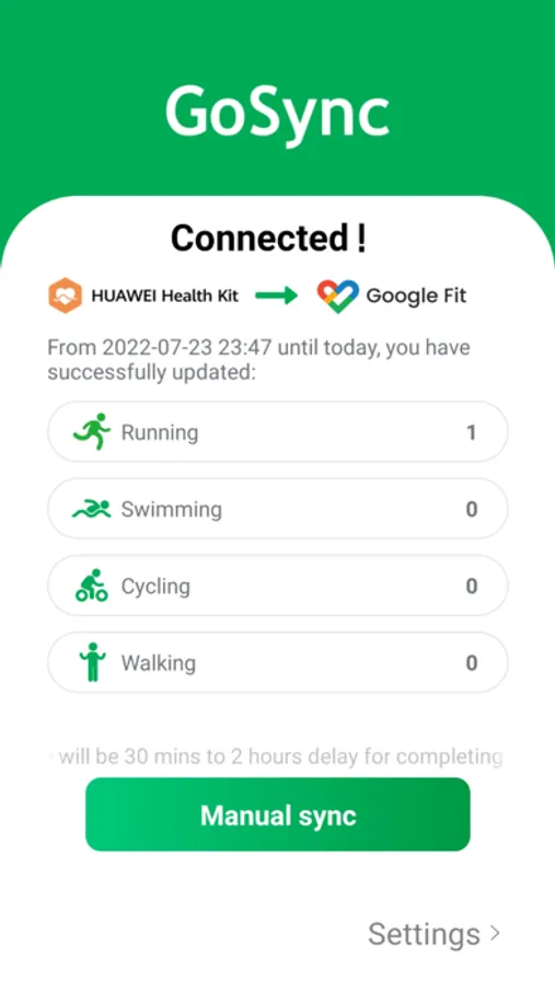 Once successfully connected, GoSync works automatically. When you finish an activity like walking, running, cycling or swimming with your wearable devices, GoSync will update the received data to your fitness platform account.