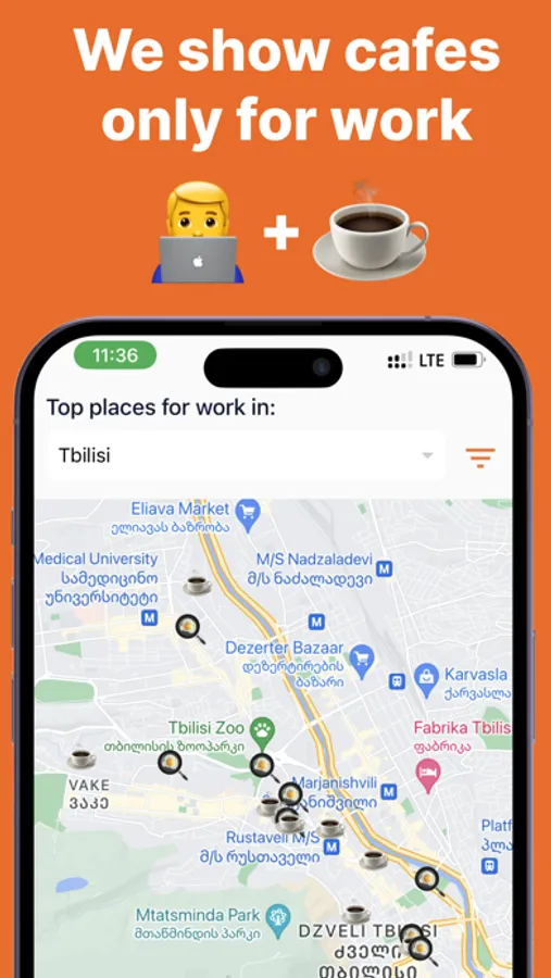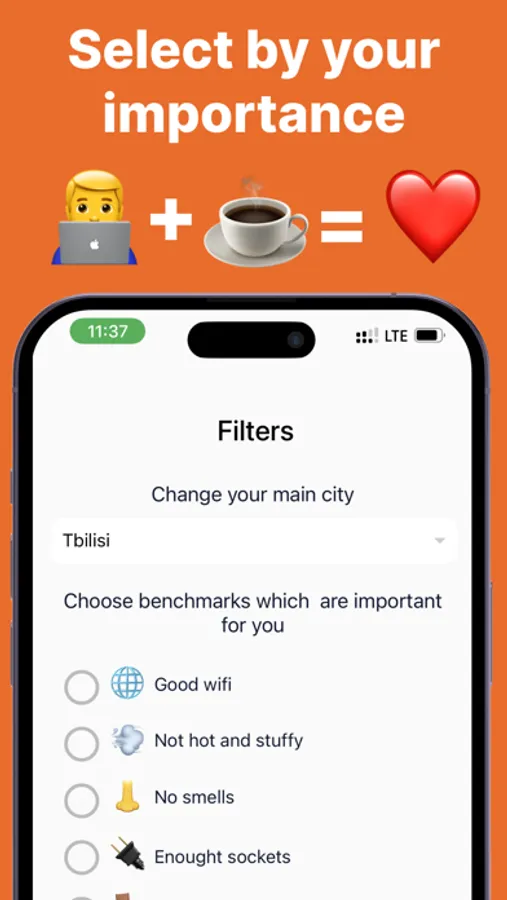 Sort places by important for you benchmarks and find the ideal cafe for work.