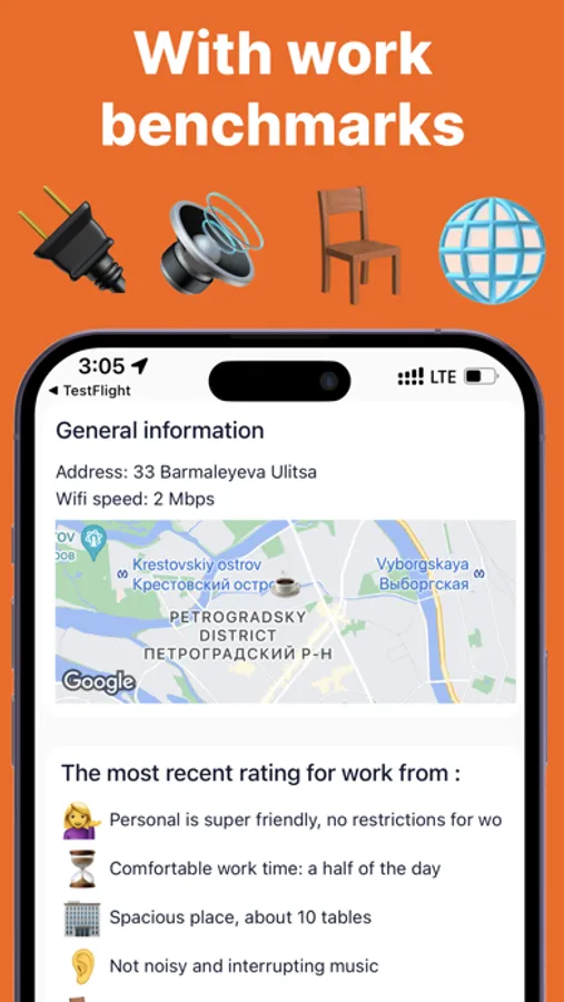 We will help you find the right cafe for work. All places have benchmarks that are important for work: