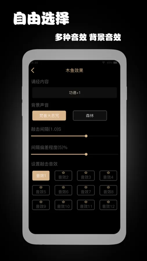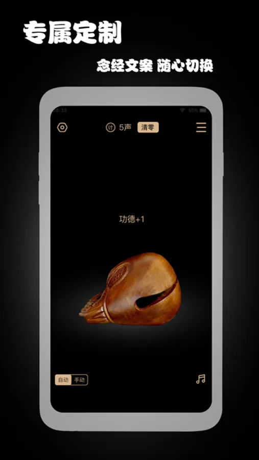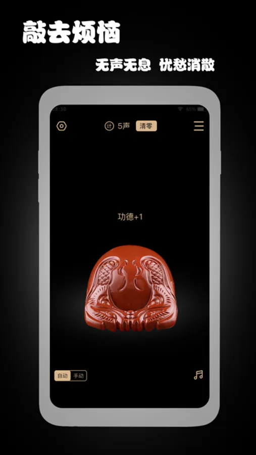 本应用可以模拟真实木鱼敲击,只需要敲击屏幕即可敲木鱼。