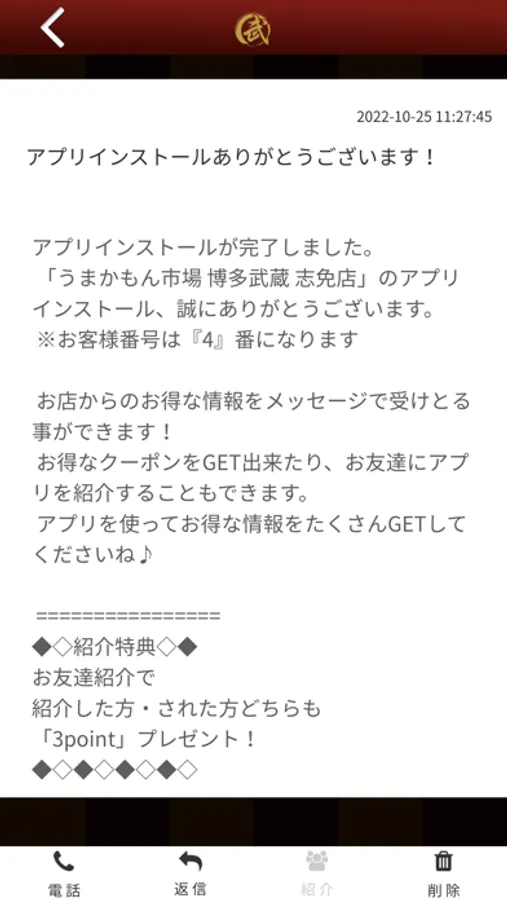 博多 武蔵のアプリをSNSを通じてお友達に紹介する事ができます。
